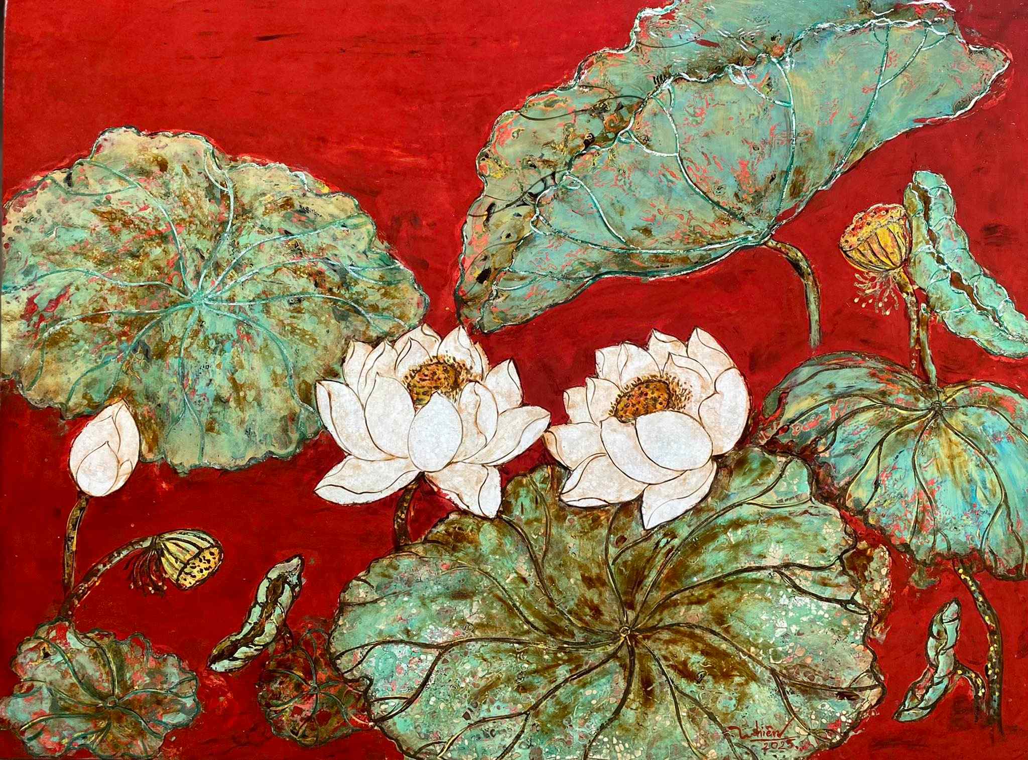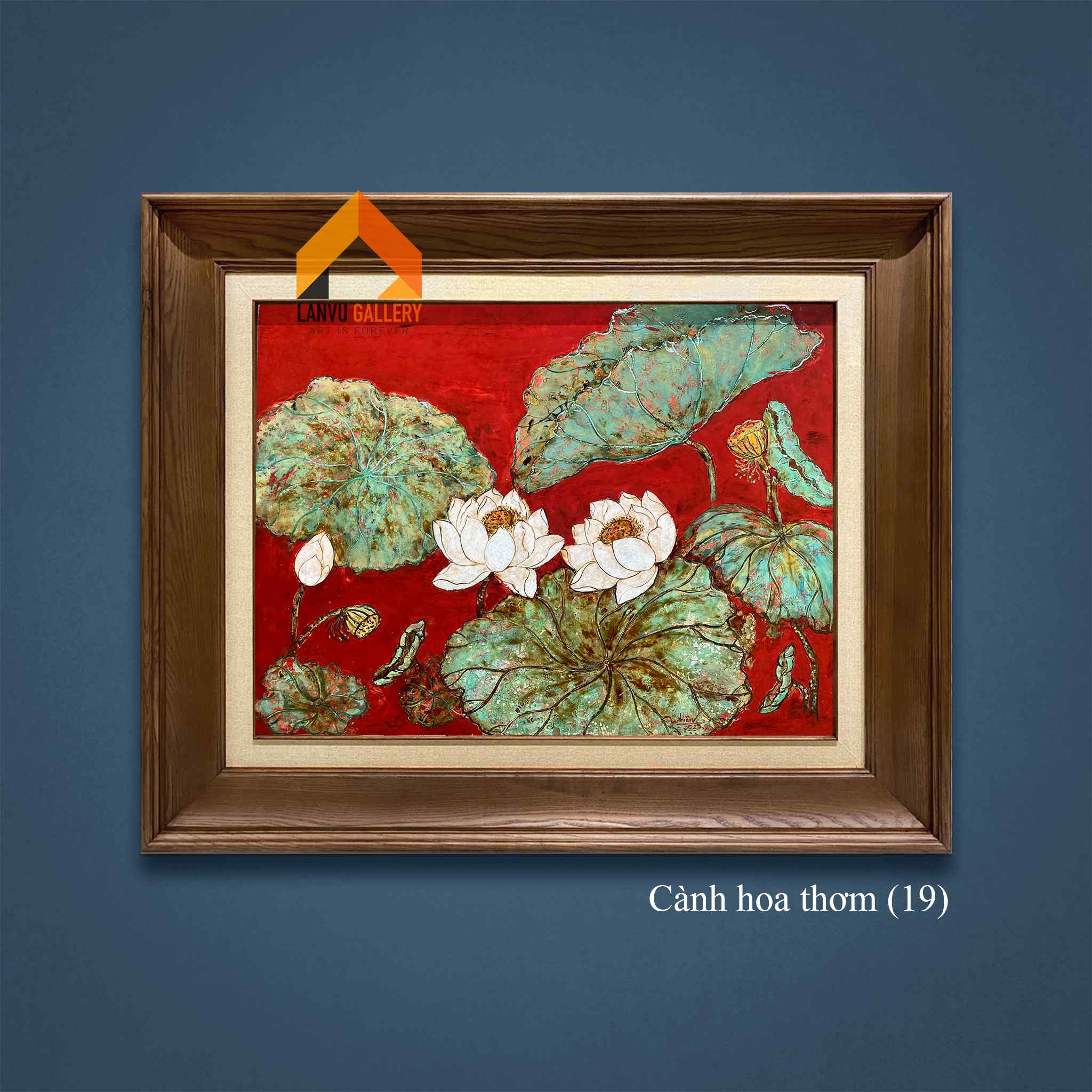 Cành hoa thơm (19) là tranh sơn mài sáng tác độc bản của họa sĩ Thùy Nhiên