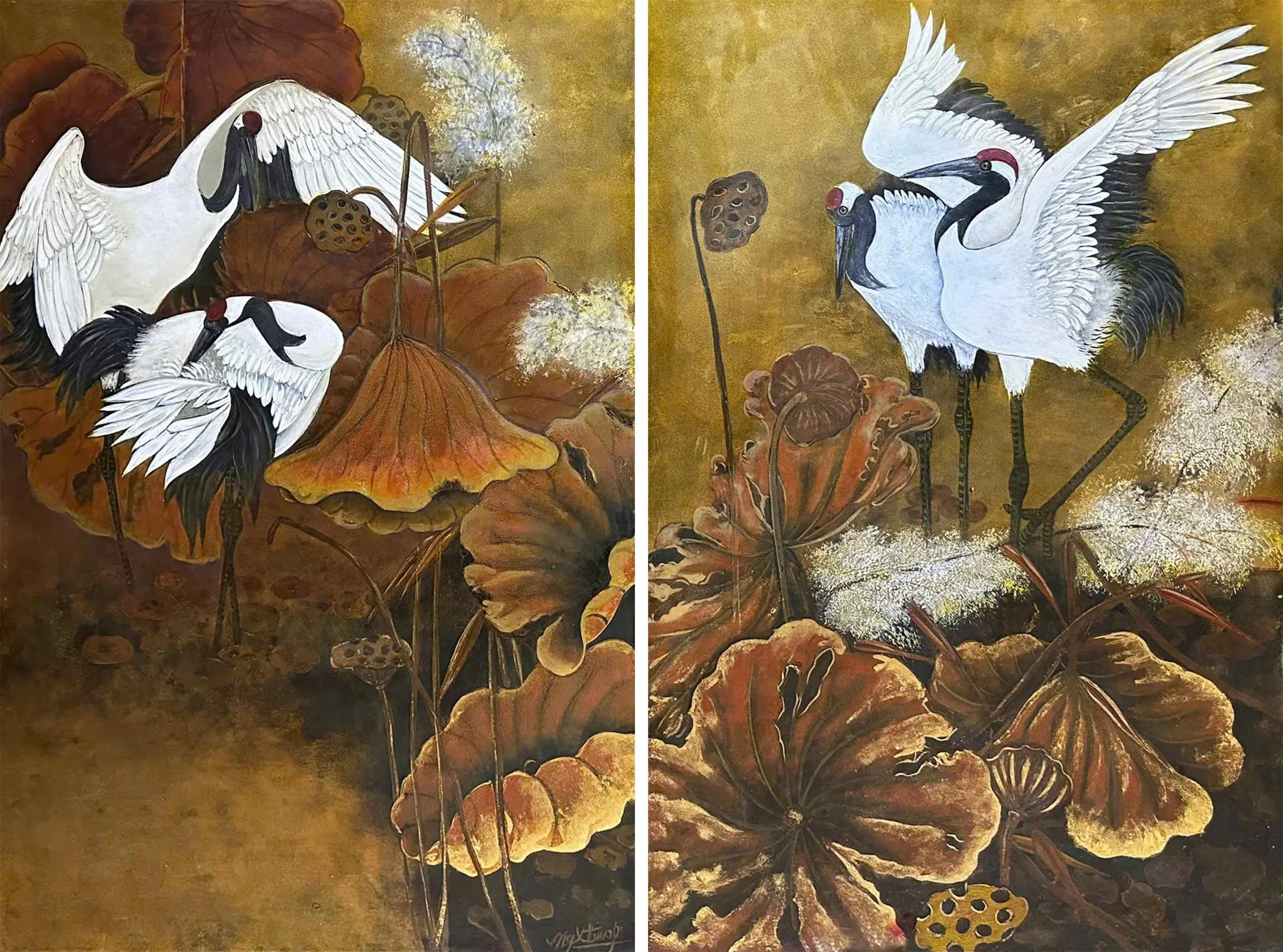 “Hạc vũ đón bình minh” tranh sơn mài sáng tác độc bản của họa sĩ Nguyễn Hương.