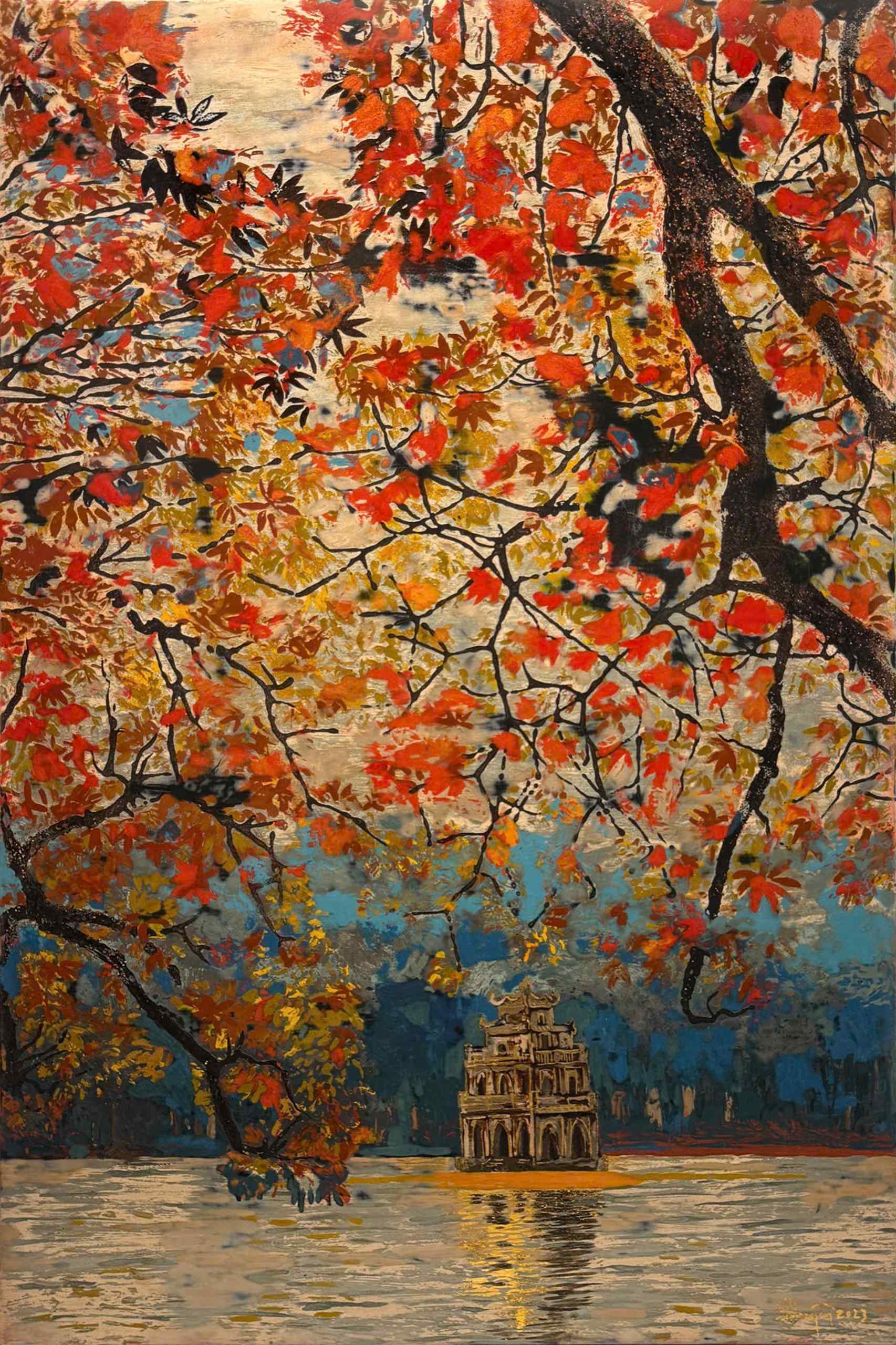 “Hồ Gươm mùa thu” là tranh sơn mài sáng tác độc bản của họa sĩ Nguyễn Lương Huyên.