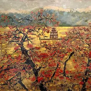“Hoa gạo Hồ Gươm” là tranh sơn mài sáng tác độc bản của họa sĩ Nguyễn Lương Huyên.