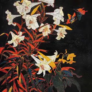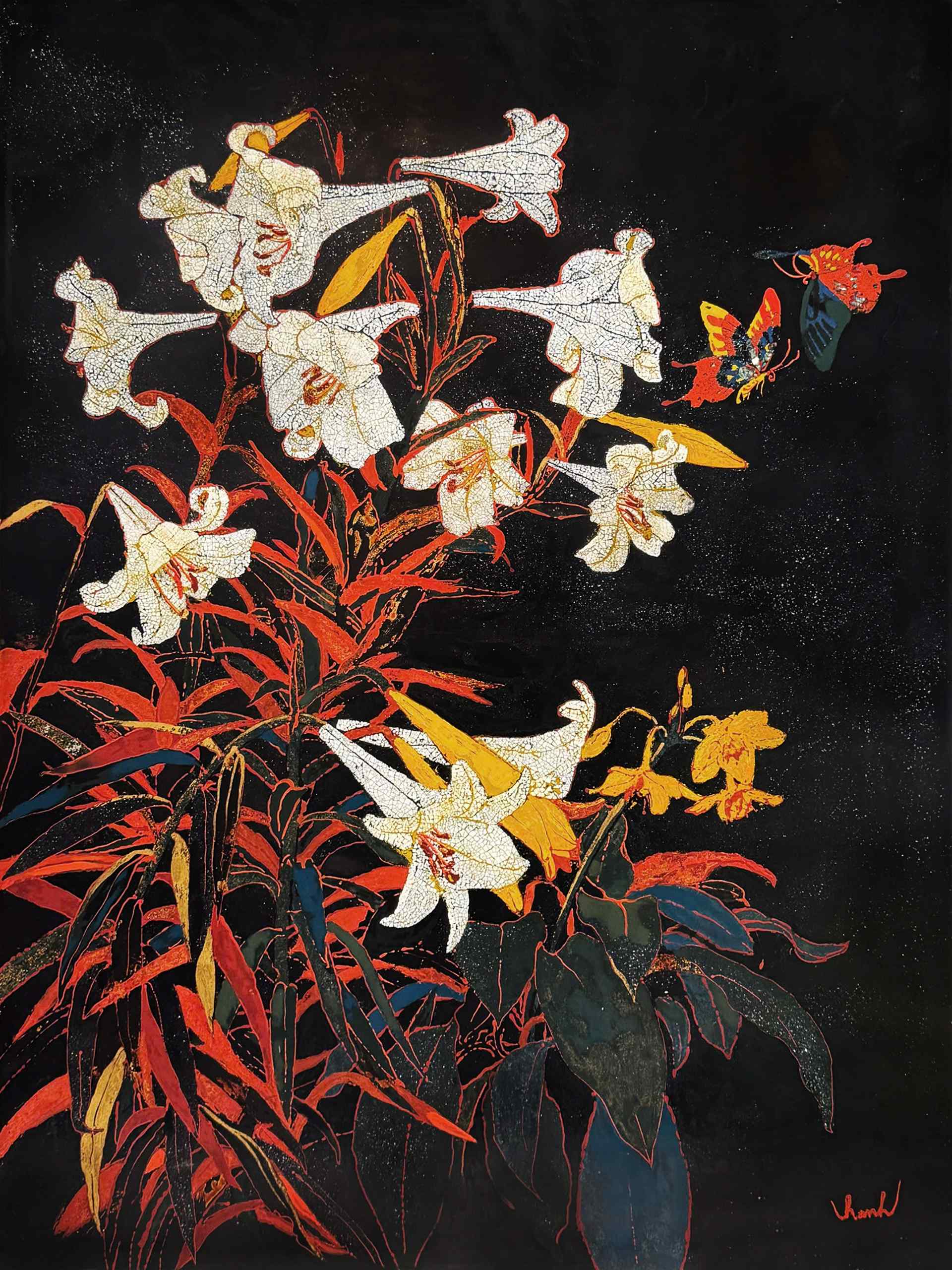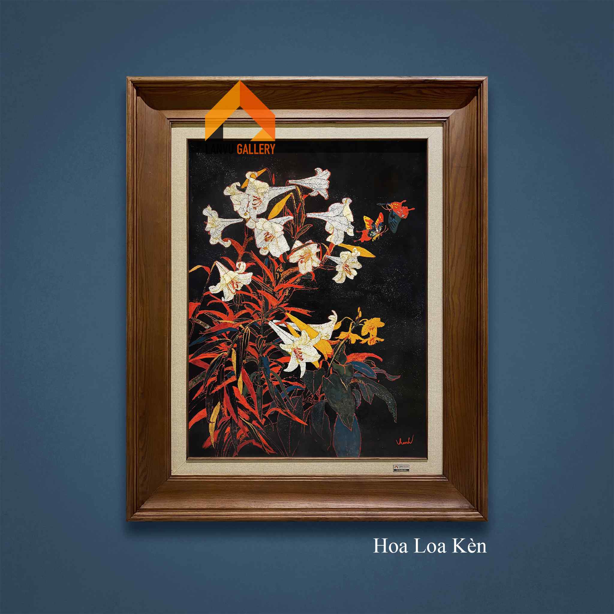 “Hoa loa kèn” là tranh sơn mài sáng tác độc bản và có giấy tác quyền của họa sĩ Huyền Thanh.