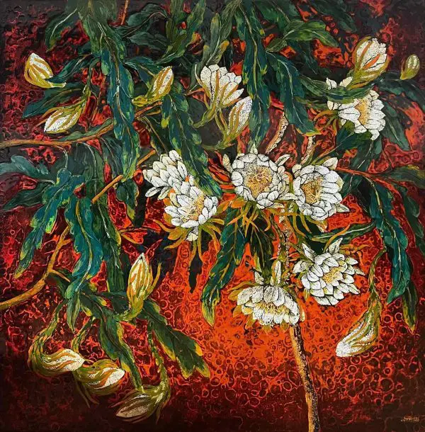 “Những đóa quỳnh hương” là tranh sơn mài sáng tác độc bản và có giấy tác quyền của họa sĩ Bảo Trân